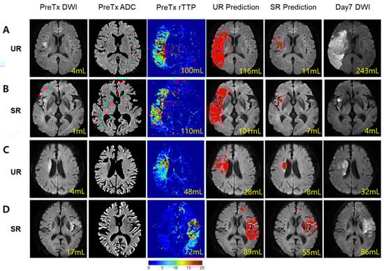 Sample external validation cases of SR- and UR-based infarct predictions. (A) A case of large infarct growth in a UR patient (intravenous thrombolysis, modified treatment in cerebral infarction (mTICI) = 0, and 90-day modified Rankin Scale (mRS) = 5). (B) A case of small infarct growth in an SR patient (endovascular therapy, mTICI = 2b, and 90-day mRS = 0). (C) A case of small infarct growth in a UR patient (endovascular therapy, mTICI = 1, and 90-day mRS = 2). (D) A case of large infarct growth in an SR patient (endovascular therapy, mTICI = 2b, and 90-day mRS = 5). Predicted infarct masks, shown in red, are overlaid on pre-treatment DWI images for UR and SR model predictions. All four patients had target mismatch presence but showed various degrees of infarct growth. The yellow numbers indicate the following volumes: (from left to right) baseline DWI lesion volume, baseline PWI lesion volume, UR-predicted infarct volume, SR-predicted infarct volume, and day-7 infarct volume.