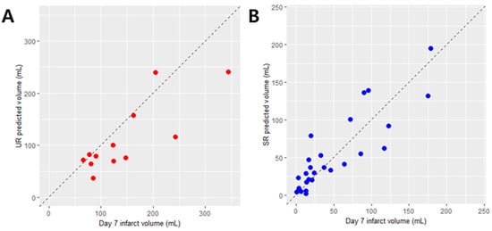 Correlation plots of (A) the UR-predicted infarct volume and (B) the SR-predicted infarct volume on the external validation UR and SR cohorts, respectively. The manual infarct volume measurement on day-7 DWI served as the reference.