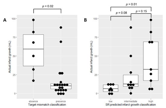 Infarct growth distribution in the external validation SR patients (n = 27). (A) Target mismatch classification. (B) SR-predicted infarct growth classification. In (A), the mismatch absence group shows a heterogeneous distribution of actual infarct growth. In (B), the high group (SR-predicted infarct growth ≥ 35 mL) shows a heterogeneous distribution of actual infarct growth, and the low group (SR-predicted infarct growth < 15 mL) shows the narrowest distribution of the actual infarct growth.