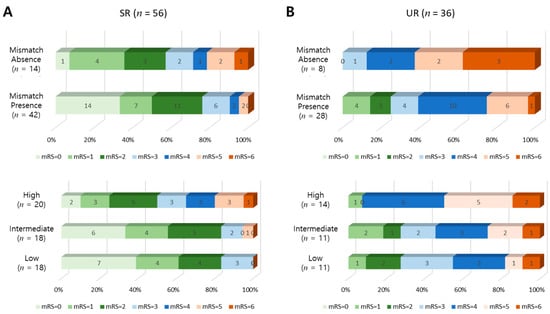 The percentage values of favorable clinical outcomes of the day-90 mRS score ≤ 1 for the mismatch presence and absence groups in overall SR patients were 50% and 36%, respectively (Figure 5A). The percentage values of favorable clinical outcomes were 61%, 56%, and 25%, respectively, for the low, intermediate, and high SR-predicted infarct growth groups (Figure 5A). In UR patients, the percentage values of favorable outcomes for the mismatch presence and absence groups were 14% and 0%, respectively, while they were 9%, 18%, and 7%, respectively, for the low, intermediate, and high UR-predicted infarct growth groups (Figure 5B).
