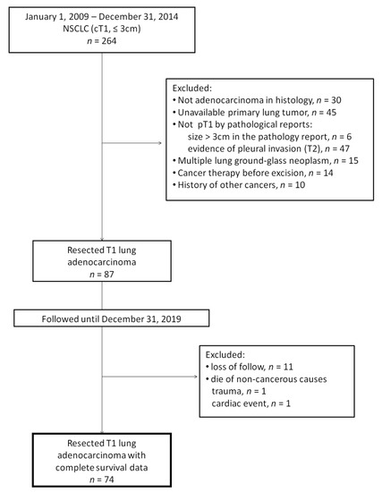 From the institution’s prospectively maintained medical database, the demographic data, pathological stage, and clinical outcomes of all the patients were retrieved and reviewed. The pathological stage was classified based on the 7th edition of the American Joint Committee on Cancer (AJCC) staging system [14]. The tumor subtypes of each patient were quantified by a scoring system introduced by Sica et al. based on subtype grading [15,16]. Minimally invasive or lepidic predominant adenocarcinoma was graded 1; acinar or papillary predominant adenocarcinoma was graded 2; and micropapillary or solid predominant adenocarcinoma was graded 3. The subtype score was the sum of the two most prominent grades. If there was only one subtype identified, the score would be doubling the grade (e.g., a tumor with a purely acinar subtype was scored 4).