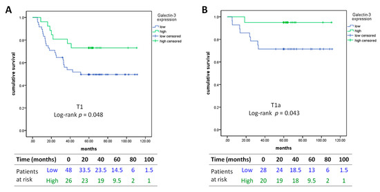 Kaplan–Meier analysis of low versus high Gal-3 expression revealed that low Gal-3 expression level was significantly correlated with poorer RFS (log-rank p = 0.048) and potentially with OS (log-rank p = 0.051) in T1 lung adenocarcinoma (Figure 3A). This correlation with RFS was also remarkable in T1a (≤ 2 cm) tumors (log-rank p = 0.043, Figure 3B).
