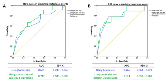 Lastly, we investigated the value of Gal-3 expression in predicting the clinical outcomes in T1a lung adenocarcinoma. Using receiver operating characteristic (ROC) curve, adding Gal-3 expression to the tumor size (tumor size minuses Gal-3 expression level) showed a larger area under the curve (AUC) than tumor size alone in both predicting events of metastasis (AUC = 0.747 vs. 0.681, Figure 4A) and recurrence (AUC = 0.813 vs. 0.766, Figure 4B).