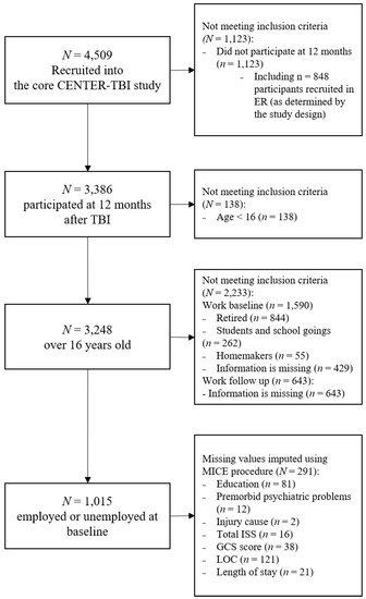 Hence, the objective of this study was to assess early relevant predictors of employment status in individuals hospitalized with TBI one year after the injury in European countries. This multi-country study, including all TBI severities, is part of the Collaborative European NeuroTrauma Effectiveness Research in TBI (CENTER-TBI) project [38]; thus, it should be possible to generalize the results to various geographical regions and populations.