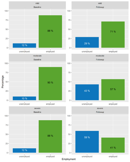 Figure 3 visualizes the relative frequencies of employed individuals at the baseline and one year after TBI by TBI severity groups. At the baseline, 10–12 percent of individuals were unemployed. While the majority of individuals after a mild or moderate TBI (71% and 57%, respectively) returned to work one year after TBI, 59% of those suffering from severe TBI were unemployed.