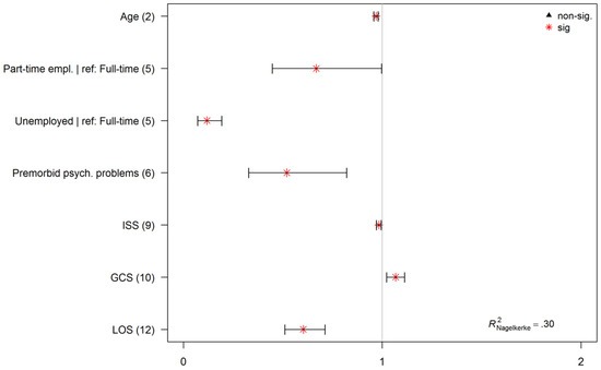 According to the final model, five (2,5,6,9, and 12) out of six factors (higher age, less than full-time employment (part-time employment or unemployment at time of injury), higher ISS and longer LOS in the hospital) were significantly associated with decreased probability of employment one year after TBI and one factor (10) (higher GCS score) significantly increased the chance of being employed (see Figure 4 for visualization). For detailed results of the model estimation, see Table 2.