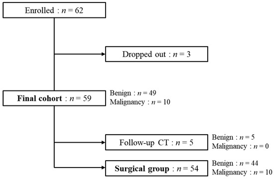 This prospective pilot study was performed at a single institute (Samsung Medical Center, Seoul, Korea) between 28 March and 19 July 2019. This research was approved by the institutional review board (IRB No. 2018-12-034) of Samsung Medical Center. Written informed consent was obtained from each participant. The calculation of the sample size was determined by our statistical team. Under the hypothesis that the difference between the AUC of IOTA-ADNEX and subjective assessment is greater than the non-inferiority margin, the difference was calculated as 0.03 on average, and the non-inferiority limit was assumed to be −0.01. The minimal number of subjects satisfying the statistical power of 80% and a significance level of 5% was 56, and at least 62 patients were required when considering the drop-out rate of 10%.