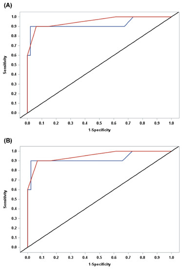 - Delong, E.R.; Delong, D.M.; Clarke-Pearson, D.L. Comparing the Areas under Two or More Correlated Receiver Operating Characteristic Curves: A Nonparametric Approach. Biometrics 1988, 44, 837. [Google Scholar] [CrossRef] [PubMed]