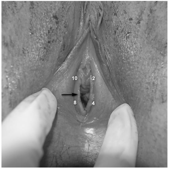 The vulvar vestibule and hymenal ring (black arrow). The assessed vestibular anatomic locations are marked by the numbers 2,4,8 and 10. The hymenal ring is intact albeit previous vaginal penetration and provokes severe pain with a gentle lateral stretching with 2 fingers.