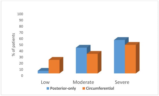 Degrees of pelvic floor hypertonicity according to vestibular tenderness location. Percentage of women with mild, moderate and severe degrees of hypertonicity, according to vestibular tenderness location (circumferential or posterior-only). Those with Posterior-only vestibular tenderness had a higher incidence of moderate and severe hypertonicity in comparison to those with Circumferential vestibular tenderness.