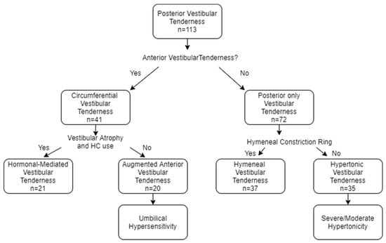 Since “PVD” is defined in the literature as vestibular pain of unknown etiology and the aim of this study was to recognize possible neglected causes, we used the terms “insertional dyspareunia” and “vestibular-tenderness” instead. The present study was based on the role of possible confounders that explain vestibular pain hypersensitivity in insertional dyspareunia [20,21,22,23,24], as well as on the previously proposed algorithm [16], which distinguishes between subgroups by incorporating localization of vulvar tenderness on examination along with the patient’s history [11,17]. We assumed that a framework of classification into subgroups is required to address the distinct etiologically based typology of insertional dyspareunia.