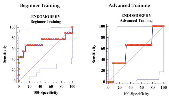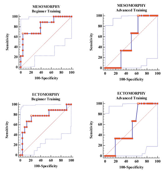 Characteristics of the ROC curves for somatotype components in the beginner training and advanced training groups.
