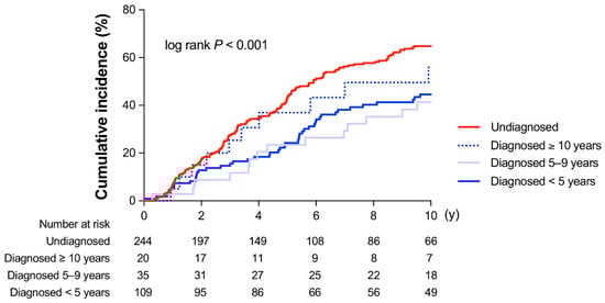 Kaplan–Meier curves for the development of diabetic kidney disease (DKD: eGFR < 60 mL/min/1.73 m2 or proteinuria) in patients with diagnosed (blue lines) or undiagnosed (red line) diabetes mellitus. The diagnosed patients were categorized accordingly: Diagnosed < 5 years, Diagnosed 5–9 years, Diagnosed ≥ 10 years duration.