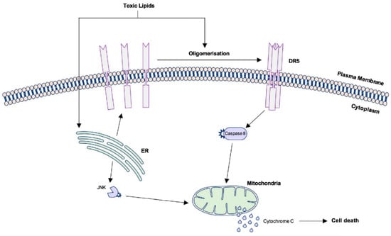 A defining feature of NASH is when lipotoxicity becomes lethal to hepatocytes, which occurs predominantly via a process known as lipoapoptosis [11,16]. Death receptors (DR) belong to the superfamily of TNF receptors and when activated on the cell surface, initiate the extrinsic pathway of apoptosis. The liver primarily expresses Fas, TNF receptor 1 and TNF-related apoptosis-inducing ligand (TRAIL) receptor 1 and 2. Upregulation of these receptors has been demonstrated in mouse models of NAFLD and human NASH liver samples [17]. TRAIL-R2, also known as DR5, is arguably the most important death receptor for apoptotic signalling in lipotoxic hepatocytes [16,17]. Ligand binding to DR5 triggers oligomerisation of the extracellular domain which initiates intracellular signalling resulting in caspase-dependent cell death. However, in lipotoxic hepatocytes, the saturated fatty acid palmitate and other toxic metabolites, especially lysophosphatidylcholine (LPC) and ceramide, not only upregulate the expression of pro-apoptotic proteins but cause rearrangement of DR domains that permits ligand-independent activation of DR5 (Figure 2) [16,17].