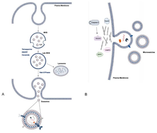 Exosomes are formed in the process of endosomal maturation, whereby the early endosome matures into a multivesicular body (MVB) and this membrane undergoes invagination to form intraluminal vesicles (ILVs) (Figure 3). MVBs are transported to and fuse with the plasma membrane, subsequently releasing their luminal contents into the extracellular environment. At this point, the ILVs are considered exosomes [34,35]. Some MVBs, however, are directed to lysosomal degradation where the contents are recycled. The regulation of this balance is not well understood but is likely influenced by the activity of small Rab guanosine triphosphatases (GTPases), due to their critical involvement in trafficking of MVBs to the plasma membrane and promotion of membrane fusion and exosome release [7,36]. Rab35, for example, is associated with an increase in ILVs at the cell surface [37] and silencing of Rab27 isoforms was shown to decrease exosome release from cells in culture [38]. Pathways of exosome biogenesis are traditionally considered dependent or independent of endosomal sorting complex required for transport (ESCRT) [34]. ESCRT-dependent biogenesis involves the formation of ESCRT complexes 0, I, II, III, which mediate invagination and scission of endosomal membranes. However, in ESCRT-independent biogenesis, ceramide is incorporated into lipid rafts in a process highly reliant on neutral sphingomyelinase 2 (nSmase2), which promotes inward budding of endosomal membranes [34,39]. Though the existence of more than one distinct pathway for biogenesis may account for some of the heterogeneity observed in exosome populations, it is suggested that the pathways work synergistically and may vary in their relative contributions to exosome production, dependent on the cell type or in response to different stimuli [33,34]. In comparison to exosomes, considerably less is known about the molecular mechanisms underlying MV release [7]. MVs are not of endosomal origin, rather production occurs by outward budding of the cell membrane. At the site of MV shedding, lipid domains, such as phosphatidylserine, are redistributed in the plasma membrane, the local cytoskeletal network is reorganised and the actin–myosin machinery contracts to alter membrane curvature and promote budding and detachment of vesicles. Notably, ADP-ribosylation factor 6 (ARF6), ESCRT components and activity of RhoA with its effector kinase ROCK1, mediated via activated caspase 3, are involved in the regulation of this process. Intracellular calcium levels also influence MV release (Figure 3) [7,33].