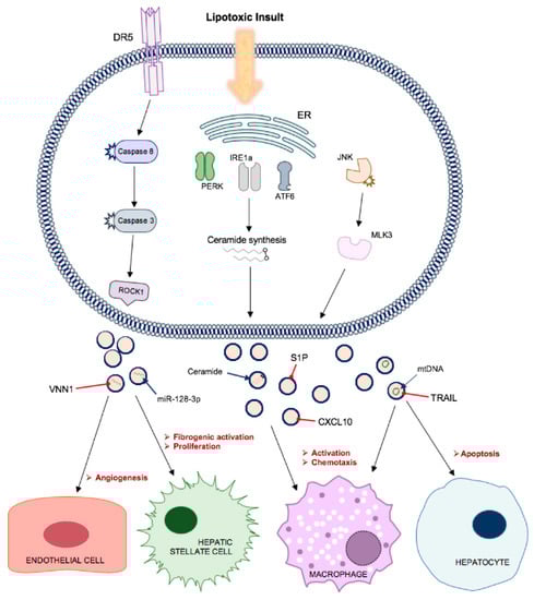 Lipotoxic hepatocytes release increased numbers of small EVs containing specific cargo that contribute to disease processes in non-alcoholic fatty liver disease. Multiple signalling pathways, including via ER stress sensors, c-Jun N-terminal kinase (JNK) and caspase activation, promote the release of EVs with cargo that promote endothelial cell migration and angiogenesis, transdifferentiation of hepatic stellate cells to a profibrogenic phenotype, macrophage activation and chemotaxis and apoptosis of neighbouring hepatocytes.