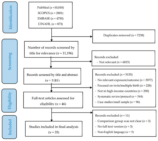 This systematic review and meta-analysis was registered with the International Prospective Register of Systematic Reviews (PROSPERO) (ID: CRD42019130933) and conducted in accordance with a previously published protocol [15]. We searched PubMed, Embase, Cumulative Index of Nursing and Allied Health Literature (CINAHL), and Scopus using different combinations of key terms and search strategies with no restriction by year of publication (Supplementary File 1). The reference lists of included studies were then checked to identify any additional relevant articles. We included only studies published in English, conducted in HICs and meeting the following criteria: (1) original studies of any design, (2) conducted on women with singleton pregnancies > 20 week’s gestation, (3) presented data/results on the association between SMM (as defined by the WHO maternal near-miss criteria) and adverse perinatal outcomes (either as a composite or by individual outcome) and reported sufficient information to calculate risk estimates. The World Bank’s definition of HICs was used [16]. We excluded studies of women with multiple pregnancy, pregnancies ending before 20 weeks of gestation, systematic reviews, case series/reports, conference papers/abstracts, proceedings, editorial reviews, letter of communications, commentaries, studies with a small sample size (n < 10) and qualitative studies.