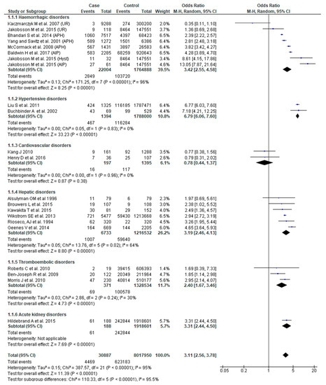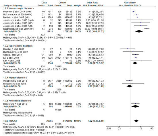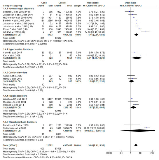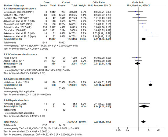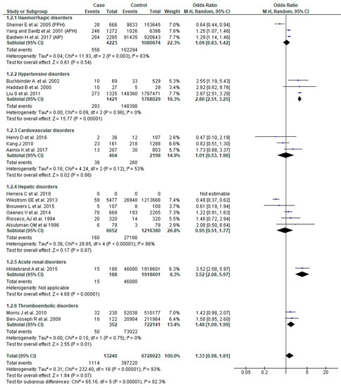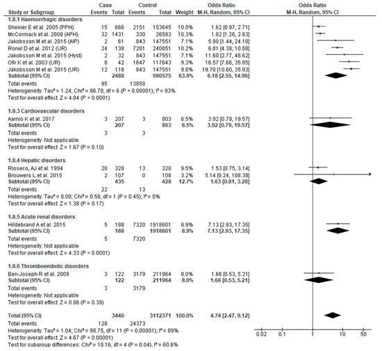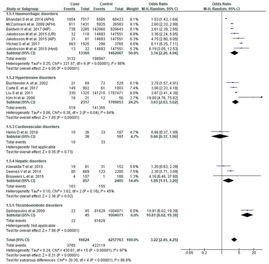 This outcome was reported in 20 studies [22,23,24,25,26,27,29,31,32,34,37,38,40,42,46,47,49,51,52,54]. Overall, women who had SMM were three times more likely to experience preterm birth (OR 3.11; 95% CI: 2.56–3.78). However, the risk of preterm birth was variably influenced depending on the underlying etiology of SMM (Chi2 = 110.58, p < 0.0001, I2 = 95.50%). Obstetric hemorrhage (OR 3.42, 95% CI: 2.55–4.58), hypertensive (OR 6.79, 95% CI: 6.06–7.60), hepatic (OR 3.19, 95% CI: 2.46–4.13) and thromboembolic disorders (OR 2.40, 95% CI: 1.67–3.46) were all associated with increased odds of preterm birth. There was, however, no significant association between SMM and preterm birth for cardiovascular disorders (Figure 2).