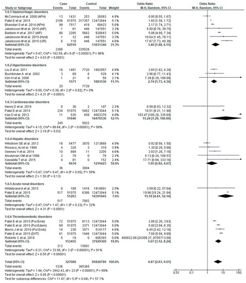 Eighteen studies [22,23,25,27,29,31,33,34,37,38,40,42,46,49,51,53,54,56] reported the association between SMM and stillbirth. Women with SMM were about five times more likely to experience stillbirth (OR 4.87, 95% CI: 2.63–9.01) compared to those without SMM. Those with cardiovascular disease (OR 15.24, 95% CI: 1.29–180.60) or acute renal (OR 15.16, 95% CI: 4.41–52.12) or thromboembolic disorders (OR 5.07, 95% CI: 3.12–8.24) had significantly higher odds of this complication (Figure 7).