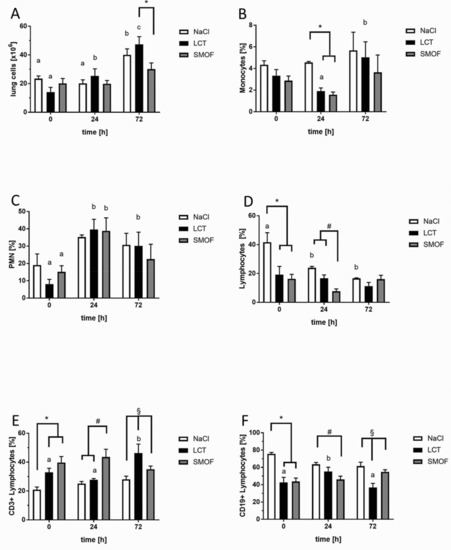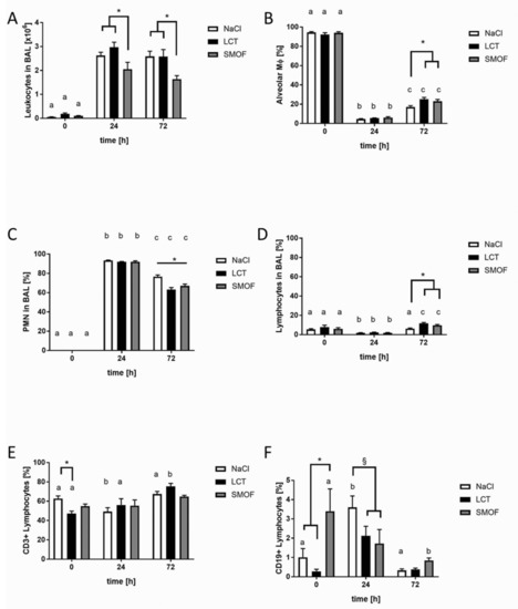 Next, we sought to analyze the effect of the different LEs on alveolar recruitment of leukocytes and their relevant sub-populations, as shown in Figure 2. After LPS stimulation, leukocytes migrated into the alveolar space, and their numbers in BAL fluid increased significantly after 24 h and 72 h in all groups compared to unstimulated controls (a, p < 0.01). At both 24 h and 72 h after induction of ARDS, the SMOF mouse group showed the lowest number of alveolar leukocytes compared to the NaCl and LCT groups (*, p < 0.01, Figure 2A). A differential cell-count analysis of BAL leukocytes was used to elucidate the percentage of monocytes/macrophages (Mϕ), polymononuclear cells (PMNs), and lymphocytes (sub-divided into CD3+- and CD19+-groups). As expected, LPS induced a significant decline in alveolar Mϕ-type cells 24 h after administration compared to unstimulated controls for all groups (a vs. b, p < 0.01; Figure 2B). After 72 h, alveolar Mϕ-type cells increased significantly compared to the 24 h values of all the intervention groups (b vs. c, p < 0.01). After 72 h of LPS stimulation, the NaCl group displayed the lowest fraction of alveolar Mϕ-type cells compared to animals receiving LEs (*, p < 0.01, Figure 2B). The percentage of PMNs in BAL fluid increased significantly both 24 h and 72 h after induction of ARDS (Figure 2C; a vs. b vs. c, p < 0.01). After 72 h, mice that received NaCl showed the highest BAL content of PMNs compared to other groups (*, p < 0.01, Figure 2C). For lymphocytes, the lowest percentage was measured 24 h after LPS administration compared to the other time points (b, p < 0.01, Figure 2D). Animals infused with NaCl also showed significantly reduced lymphocytes compared to the LE groups 72h after LPS instillation (*, p < 0.01, Figure 2D). Sub-analysis of the lymphocyte population indicated that, under unstimulated conditions, application of LCT significantly reduced CD3+ lymphocytes compared to the NaCl group (*, p < 0.01, Figure 2E). For CD19+ lymphocytes, SMOF infusion significantly elevated the proportion of these cells compared to the other groups before the LPS challenge (*, p < 0.01, Figure 2F). After 24 h, the highest proportion was in NaCl mice compared to LCT and SMOF mice (§, p < 0.01, Figure 2F).
