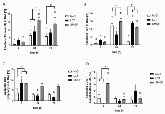 Apoptosis was assessed in different alveolar cell types within the context of murine ARDS (Figure 3). At both 24 h and 72 h after ARDS induction, mice in the NaCl and SMOF groups showed increased apoptotic alveolar Mϕ-type cells compared to unstimulated controls (a vs. b, p < 0.01, Figure 3A). Mice that received SMOF displayed significantly more apoptotic cells compared to NaCl and LCT mice after 24 h (*, p < 0.01, Figure 3A). After 72 h, the percentage of apoptotic alveolar Mϕ-type cells was higher in the SMOF group compared to the NaCl group (#, p < 0.01, Figure 3A). For PMNs in BAL fluid, all groups significantly differed from each other 24 h after LPS challenge (*, p < 0.01, Figure 3B). After 72 h, the NaCl group showed significantly fewer apoptotic PMNs compared to the LCT and SMOF groups (#, p < 0.01, Figure 3B). As depicted in Figure 3C, mice infused with NaCl had a lower percentage of apoptotic CD3+ lymphocytes in BAL fluid compared to LCT and SMOF mice under unstimulated conditions (*, p < 0.01, Figure 3C). Furthermore, mice that received LCT had the highest percentage of apoptotic CD3+ lymphocytes under unstimulated conditions compared to the other time points (a vs. b, p < 0.01). Similar results were obtained for apoptotic CD19+ lymphocytes in BAL fluid (Figure 3D). Without LPS stimulation, SMOF application induced significantly higher apoptosis in this cell type compared to the NaCl and LCT groups (*, p < 0.01, Figure 3D). In addition, counts of apoptotic CD19+ lymphocytes in SMOF-cohort BAL fluid were highest under unstimulated conditions compared to the other time points (a vs. b, p < 0.01).