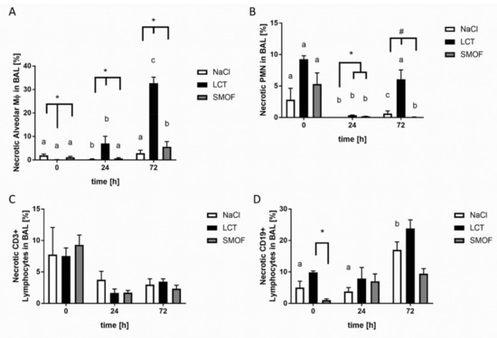 Assessment of necrotic alveolar Mϕ-type cells revealed that mice that received LCT infusions significantly differed from the other groups (*, p < 0.01, Figure 4A). The highest LCT group values were seen 24 h and 72 h after ARDS induction compared to unstimulated controls (a vs. b vs. c; p < 0.01). For necrotic PMNs, mice that received either LCT or SMOF had significantly higher proportions of necrotic PMNs compared to the NaCl group 24 h after LPS stimulation (*, p < 0.01, Figure 4B). After 72 h of stimulation, all groups differed significantly from each other, with the highest value seen in the LCT group (#, p < 0.01, Figure 4B). No significant changes in necrotic CD3+ lymphocytes were found (Figure 4C). For necrotic CD19+ lymphocytes in BAL fluid, mice infused with LCT displayed significantly more necrosis compared to SMOF-infused mice under non-inflammatory conditions (*, p < 0.01, Figure 4D).