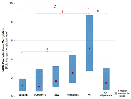 PADI4 promoter gene methylation level in RA groups according to DAS28 activity, HC and all RA patients. Results presented as median and interquartile range. (a) p = 0.00002; (b) p = 0.00004; (c) p = 0.023; (d) p = 0.00001, Remission vs. HC p = 0.07.