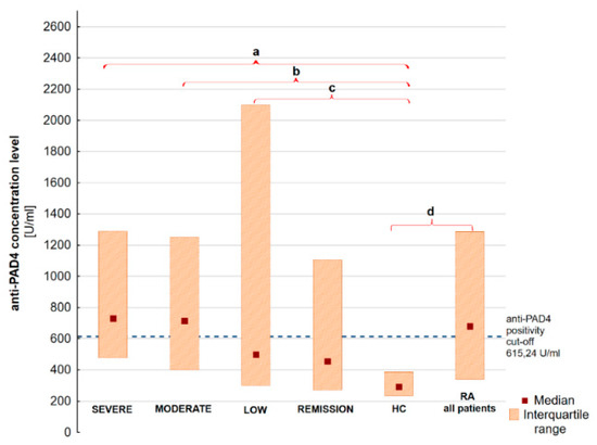 Anti-PAD4 concentration level in RA groups according to DAS28 activity, HC and all RA patients. Results presented as median and interquartile range. (a) p = 0.000018, (b) p = 0.000095, (c) p = 0.038, (d) p = 0.00001. RA moderate vs. Remission p = 0.054, RA low vs. HC p = 0.07.