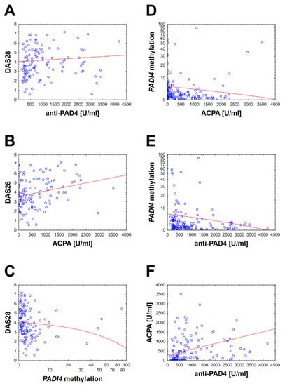 Spearman’s rank correlation between studied parameters. Presented variables are statistically significant with the p-value < 0.05. Diagrams from A to F shown correlations between two variables and the following correlation coefficients (rs): (A) correlation between DAS28 and anti-PAD4 with rs = 0.19; (B) correlation between DAS28 and ACPA with rs = 0.22; (C) correlation between DAS28 and PADI4 methylation with rs = −0.34; (D) correlation between PADI4 methylation and ACPA with rs = −0.26; (E) correlation between PADI4 methylation and anti-PAD4 with rs = −0.25; (F) correlation between ACPA and anti-PAD4 with rs = 0.52.