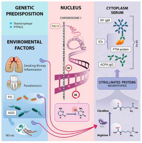 Pathways to RA development. The individuals with genetic predisposition (MHC—shared epitope, SNP of PTPN22) exposed to environmental factors (smoking, airway inflammation, periodontitis) have developed a shift in PADI4 gene methylation degree. The airway inflammation and smoking are connected with higher PAD activity [40]. NET-osis is a PAD4-dependent mechanism used during the host immunological response against exogenous bacteria like PG and ACC [41,42,43]. Additionally PG is a bacteria with its own PAD4 activity [44]. The dysregulation of PAD4 gene expression via methylation depends on the environmental impact on the mouth and lungs leading to elevated expression of PAD4 enzyme and increased conversion of arginine to citrulline in various proteins, leading to a loss of tolerance to citrullinated proteins and APCA synthesis. The ICs of citrullinated proteins and ACPA IgG become an antigen to RF production. After a period of ACPA and/or RF positivity called pre-RA and unknown “second hit”, the development of arthritis/synovitis is influenced in patients. Abbreviations: PG, Porphyromonas gingivalis; AGG, Aggregatibacter actinomycetemcomitans; ME, methylation; ICs, immunological complexes; ACPA, anti-citrullinated protein antibodies; PTM, proteins post-translationally modified proteins; PAD4, peptidyl arginine deiminases type 4; RF, Rgeumatoid Factor; Pre RA, pre-Rheumatoid Arthritis; PTPN22, Protein tyrosine phosphatase, non-receptor type 22, NET-osis Neutrophil extracellular traps activation and release.