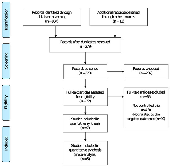 The selection process of this systematic review and meta-analysis is shown in Figure 1, retrieving a total of 279 potentially relevant articles. A total of seven studies were included in the systematic review, and five of them in the meta-analysis.