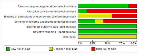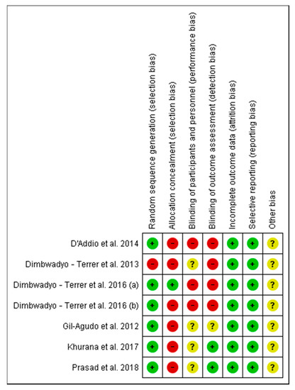 - Higgins, J.P.T.; Altman, D.G.; Gøtzsche, P.C.; Jüni, P.; Moher, D.; Oxman, A.D.; Savović, J.; Schulz, K.F.; Weeks, L.; Sterne, J.C.A. The Cochrane Collaboration’s tool for assessing risk of bias in randomised trials. BMJ 2011, 343, d5928. [Google Scholar] [CrossRef]