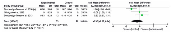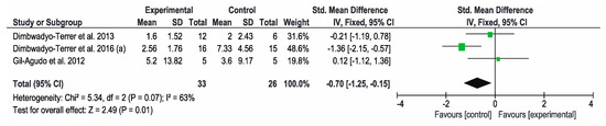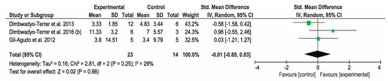 Finally, the BI was used to measure the functional status in three of the studies [2,7,11]. The overall result of the meta-analysis was not conclusive and control groups got better results than intervention groups. The study by Dimbwadyo-Terrer et al. (2016) (a) [2] obtained the best results for the control group that carried out CPT. Figure 7 shows the results of the meta-analysis.