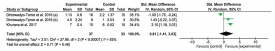 Concerning the results obtained in the SCIM, the other three studies [7,11,34] used this instrument to assess the functional status. The overall result of this meta-analysis was not conclusive. Favorable results for the control group were obtained in the study by Dimbwadyo-Terrer et al. (2013) [11], while favorable results for the intervention group were obtained in the study by Dimbwadyo-Terrer et al. (2016) (b) [34]. However, none of these results were statistically significant. SCIM self-care subtest was also used to assess the functional performance in three studies [2,34,35]. The overall result of this meta-analysis was not conclusive. Favorable results for the control group were obtained in the study by Dimbwadyo-Terrer et al. (2016) (a) [2], while favorable results for the intervention group were obtained in the study by Khurana et al. [35]. Only the results of Khurana were statistically significant. Figure 5 and Figure 6 show the results of the meta-analysis.