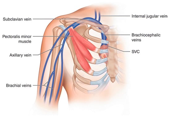 - Hughes, E.S.R. Venous obstruction in the upper extremity. Br. J. Surg. 1948, 36, 155–163. [Google Scholar] [CrossRef]