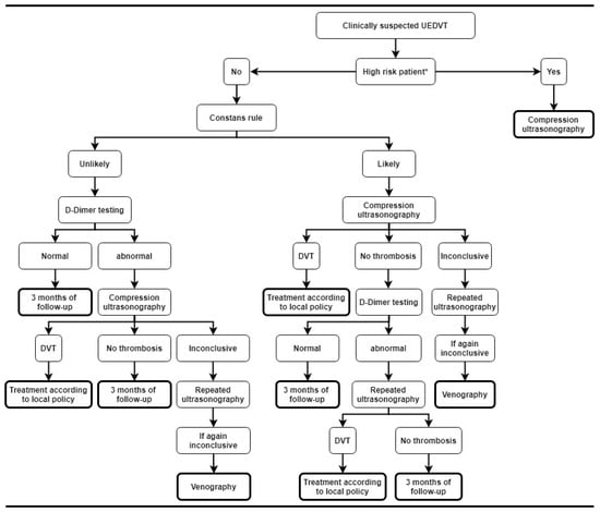 Diagnostic algorithm for upper extremity deep vein thrombosis based on the Armour study. * High risk patients: patients with malignancy, central venous catheter, or pacemaker, inpatients, or elderly (≥75 year old). Abbreviations: UEDVT, upper extremity deep vein thrombosis; DVT, deep vein thrombosis.