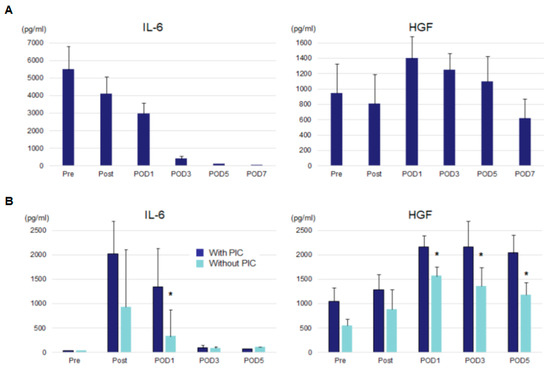 Serum IL-6 and HGF levels of patients with sepsis (A) and those who underwent esophagectomy (B). IL-6, interleukin-6; HGF: hepatocyte growth factor, POD: postoperative day, PICs: postoperative infectious complications. * p < 0.05 vs. patients with PIC.