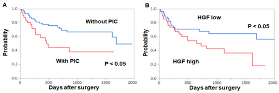 The patients with PICs had poorer overall survival than those without PICs (p < 0.05, Figure 2A). Similarly, the patients whose HGF levels on POD 3 increased three times or more than the preoperative values showed poorer overall survival than those showing less than three times changes (p < 0.05, Figure 2B).