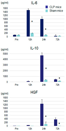 Serum IL-6, IL-10, and HGF levels after CLP or sham operation. IL: interleukin, HGF: hepatocyte growth factor, CLP: cecal ligation and puncture. * p < 0.05 vs. CLP mice.