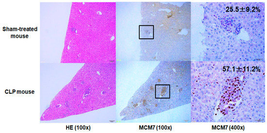 Representative images of HE and MCM7 staining of liver metastases at 7 days after surgery in sham-treated and CLP mice. The mean MCM7 labeling indices were inserted in each right upper panel. At least five independent experiments were performed in both sham-treated and CLP mice, and similar results were obtained.