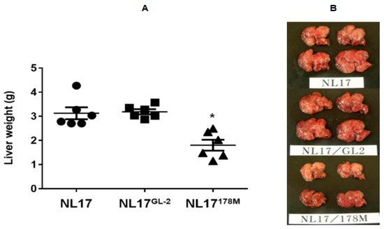 The liver weights 14 days after CLP using NL-17 cells with 178M and control virus in the murine liver metastasis model. A: Liver metastasis of NL17 cells infected with control virus (NL17GL-2) showed similar levels to that of noninfected NL17 cells at 14 day after CLP. In contrast, significant decrease in liver metastasis was observed in NL17 cells infected with 178M virus at moi 100 (NL17178M) (n = 6). * p < 0.05 vs. noninfected NL17 cells and NL17 cells infected with control virus (NL17GL-2). B: Representative images of macroscopic liver metastases on day 14 are depicted.