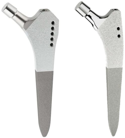 - Nysted, M.; Foss, O.A.; Klaksvik, J.; Benum, P.; Haugan, K.; Husby, O.S.; Aamodt, A. Small and similar amounts of micromotion in an anatomical stem and a customized cementless femoral stem in regular-shaped femurs. A 5-year follow-up randomized RSA study. ACTA Orthop. 2014, 85, 152–158. [Google Scholar] [CrossRef]