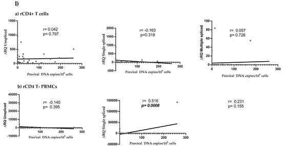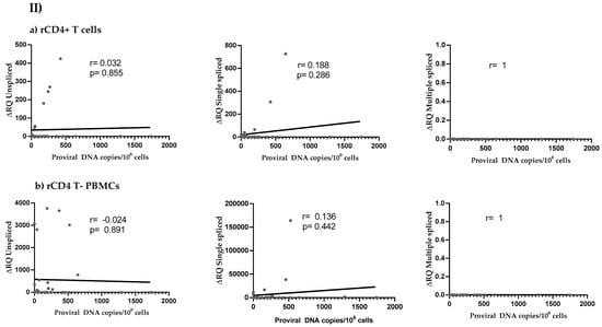 Linear correlations between HIV reservoir size (expressed as number of integrated HIV proviral DNA copies per million cells) and HIV viral splicing (expressed as ΔRQ) were assessed (Figure 3). Positive correlations were observed in all study groups for some HIV splicing forms, mostly single and multiple spliced transcripts.