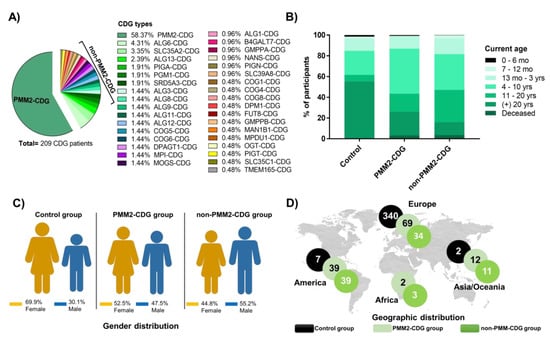 Our questionnaires assessed 209 CDG patients and 349 healthy participants. PMM2-CDG was the most represented CDG (58.4%, n = 122/209) and included 4 deceased patients (Table S4). In total 35 different CDG were included. After PMM2-CDG, ALG6-CDG (MIM:603147) (4.3%, n = 9/209) and SLC35A2-CDG (MIM: 300896) (3.3%, n = 7/209) were the most reported (Figure 1A). This prevalence echoes published data on these CDG [,,]. All these CDG were clustered and herein referred to as the non-PMM2-CDG group (Figure 1A). The study had a diverse distribution of participants amid the control, PMM2-CDG and non-PMM2-CDG groups concerning age (Figure 1B), gender (Figure 1C) and geographic distribution (Figure 1D). Most CDG patients were diagnosed before 5 years of age (74.2%, n = 155/209) (Figure S1A). Only 17.2% of PMM2-CDG patients (n = 21/122) received a diagnosis from 6-years-old onwards, whereas among non-PMM2-CDG patients this percentage was 37.9% (n = 33/87). Of note, 4.1% of the PMM2-CDG patients (n = 5/122) were diagnosed from 25-years-old onwards. No diagnoses were made after 25 years of age in non-PMM2-CDG (Figure S1A). This reflects the growing adult PMM2-CDG population, patient phenotypic heterogeneity and probably the differences in access to diagnosis across countries [,]. Mothers were the most common ImmunoCDGQ respondents (in 82.8%, PMM2-CDG—n = 101/122—and in 87.4% non-PMM2-CDG—n = 76/87). This is similar to what is described in other rare disease studies [], []. In the ImmunoHealthyQ, most participants reported themselves (55.9%, n = 195/349) (Figure S1B).