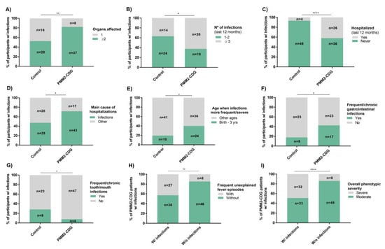 Multiple infections, associated hospitalizations, frequent unexplained fever episodes (FUFEs) and overall increased phenotypic severity. (A) Presence of multiple infections (affecting different organs) at present. Statistical significance refers to the comparison between participants reporting infections in at least two different organs (grouped) and participants reporting infection in only one organ (p = 0.0047 (**)/OR = 4.09) Dead patients were excluded from this analysis; (B) Nº of infections in the past 12 months. Respondents who replied 3–6, 7–10 and 10+ infections were grouped for this analysis. Statistical significance refers to the comparison between participants reporting 1–2 and patients reporting >3 infections (p = 0.029 (*)/OR = 2.82); (C) Infection-driven hospitalizations in the past 12 months. Participants who replied, “I don’t know” and dead patients were excluded from this analysis. Statistical significance refers to the comparison between participants who had experienced infection-related hospitalizations and those who had not (p = 3.22 × 10−5 (****)/OR = 8.51); (D) Infections as the main cause of hospitalization. Participants who replied that infections were or had been the main cause of hospitalization were grouped forming the “Infections” group, while those who replied, “I don’t know” and dead patients were excluded from this analysis. Statistical significance refers to the comparison between participants identifying infections as the main cause of hospitalization against those who did not (p = 0.012 (*)/OR = 2.81); (E) Age when infections were more frequent and/or severe. Respondents answering infections were more clinically relevant between birth and 3 years were compared to all other participants who reported a different age range (named “Other ages”). Statistical significance refers to the comparison between these two groups of participants (p = 0.023 (*)/OR = 2.71). Participants replying “I don’t know” were excluded from this analysis; The most and least prevalent frequent/chronic infections in PMM2-CDG were (F) GI infections (p = 0.039 (*)/OR = 3.34) and (G) frequent/chronic tooth/mouth infections (p = 0.026 (*)/OR = 0.22) in controls. Statistical significance refers to the comparison between participants with frequent or chronic infections (grouped) and participants who never experienced these infections; (H) FUFEs prevalence among PMM2-CDG patients with and without infections. Statistical significance refers to the comparison between these patients (p = 0.0011 (**)/OR = 4.26). Participants unaware of FUFEs presence/absence were omitted from this analysis; (I) Overall phenotypic severity in PMM2-CDG patients according to infection presence/absence. Patients with either mild or moderate phenotypes were grouped forming the “Moderate” variable, and patients with severe or very severe phenotypes were combined constituting the “Severe” group. Statistical significance refers to the comparison of the prevalence of “Moderate” and “Severe” phenotypes in PMM2-CDG patients with or without infections (p = 3.93 × 10−5 (****)/OR = 5.85). All statistical significance was calculated with Fisher’s exact test.