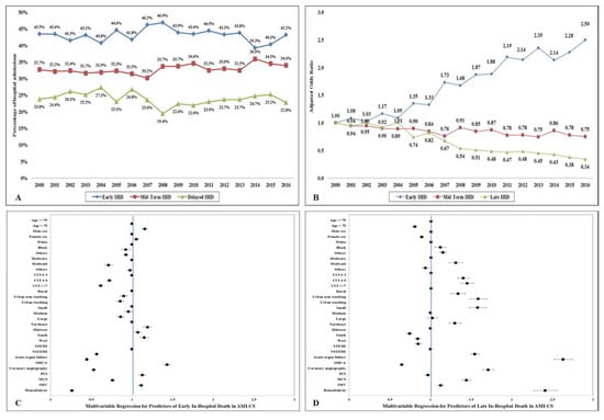Epidemiology and predictors of in-hospital death in AMI-CS. (A) 17-year unadjusted temporal trends of early, mid-term and late IHD in AMI-CS; all p < 0.001 for trend over time; (B): 17-year adjusted * temporal trends for early, mid-term and late IHD in AMI-CS (referent year 2000); all p < 0.001 for trend over time; (C,D) the adjusted odds ratios for early (C) and late (D) IHD in AMI-CS **. * Adjusted for age, sex, race, primary payer status, socio-economic stratum, hospital characteristics, comorbidities, acute organ failure, AMI-type, cardiac procedures, and non-cardiac procedures. ** For cohorts with multiple categories (i.e., age, sex, race, primary payer, Charlson Comorbidity Index, hospital location and teaching status, hospital bed size, hospital region and AMI type), the first category was used as reference category for calculating odds ratios. Abbreviations: AMI: acute myocardial infarction; CCI: Charlson Comorbidity Index; CS: cardiogenic shock; IHD: in-hospital death; IMV: invasive mechanical ventilation; MCS: mechanical circulatory support; NSTEMI: non-ST-segment elevation myocardial infarction; OHCA: out-of-hospital cardiac arrest; PCI: percutaneous coronary intervention; STEMI: ST-segment elevation myocardial infarction.