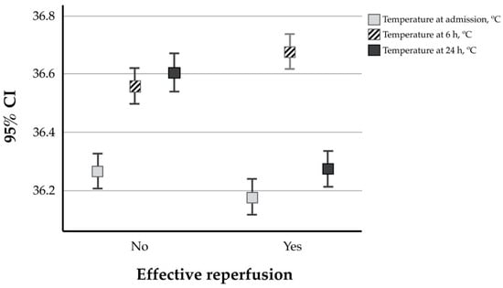 Figure 1. Temperatures at admission and 6 h 24 h in relation to reperfusion effectiveness.