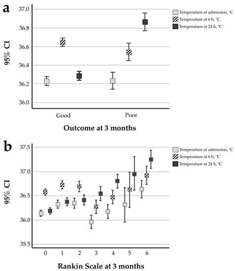 Figure 2. Evaluation of functional outcomes at 3 months. (a) Temperatures at admission and 6 and 24 h in relation to patient outcomes. (b) Temperatures at admission and 6 and 24 h in relation to modified Rankin Scale scores at 3 months.