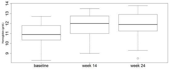 In line with the above results, the median values of hemoglobin increased following Vedolizumab treatment, even though a statistically significant difference was seen between baseline (median value: 10.9; interquartile range: 10.3–12.7) and week 14 (median value: 12; interquartile range: 11–13.5; p = 0.016) but not week 24 (median value: 11.9; interquartile range: 11.2–13.8; p = 0.186), as shown in Figure 1.