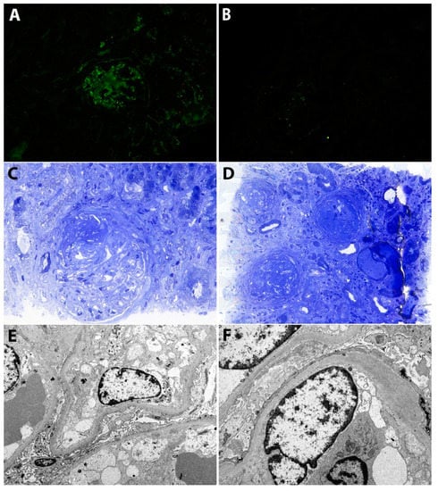 (A) Immunofluorescence. Moderate staining for IgG in the mesangium and along the glomerular capillary walls. (B) Immunofluorescence. Minimal staining for C3 in the mesangium and along the glomerular capillary walls. (C) Light microscopy (Toluidin Blue). Glomerulus with a membranoproliferative pattern of injury, fibrinoid necrosis and a fibro-cellular crescent. (D) Light microscopy (Toluidin Blue). Glomeruli showing a membranoproliferative pattern with diffuse lobular accentuation (mesangial expansion with hypercellularity, endocapillary hypercellularity and fibrous crescents). There is also moderate tubular atrophy and interstitial fibrosis. (E,F) Electron microscopy. There are subendothelial, unstructured, electron-dense deposits. Podocytes show diffuse foot process effacement. Additionally, there is severe endothelial injury with swollen glomerular endothelial cells and loss of fenestrations.